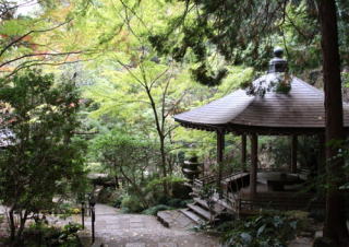 各宗祖師の庭深い木々から漏れる光に照らされて背後に駒ヶ滝があります