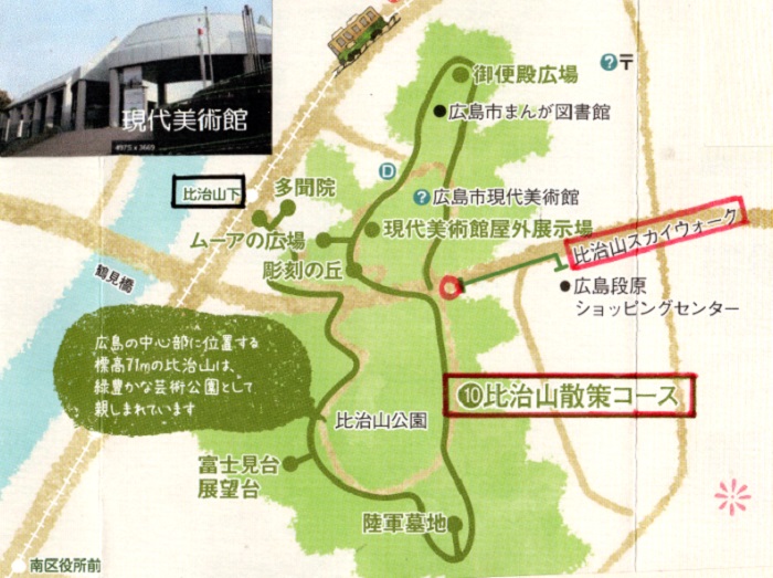 広島の中心部に位置する標高71mの比治山は、緑豊かな芸術公園として親しまれています。広島市現代美術館、広島市まんが図書館、散策路などをとりまく彫刻は、自然と芸術を同時に楽しめる贅沢な散策を体験していただくことができます。さらに、陸軍墓地や御便殿跡は忘れてはいけない広島の歴史を語りかけてくれます。